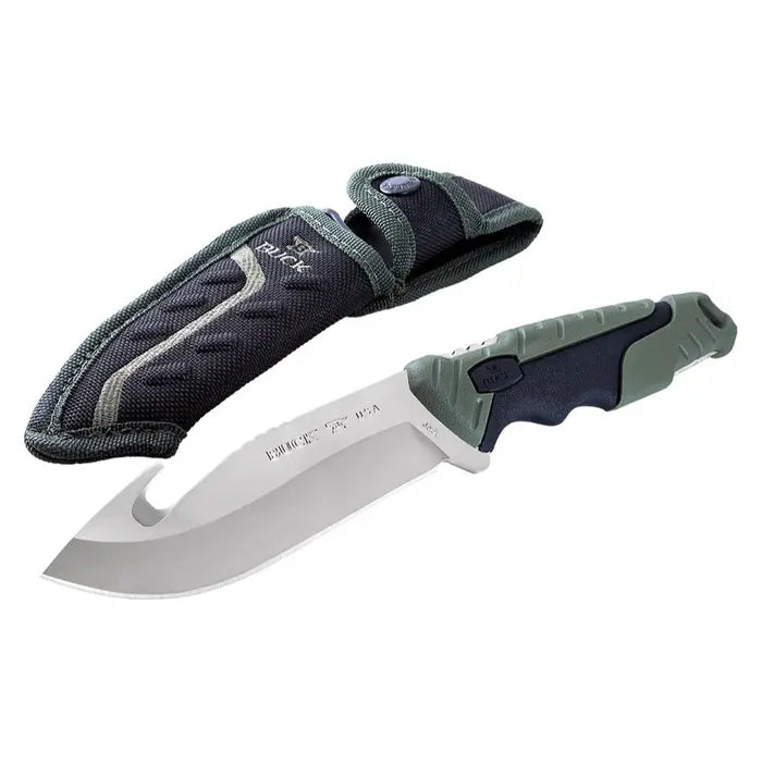 The Buck 659 Pursuit Large Gut Hook Knife is a multi-purpose alternative to a traditional hunting knife. The Pursuit Series is designed for all hunters from the beginner to most experienced. Sporting a comfortable and non-slip grip with excellent and dependable blade. The full tang runs the length of the handle and extends into the handle material. Making the knife strong and reliable, perfect for heavy duty tasks. Comes with a heavy-duty polyester sheath.
