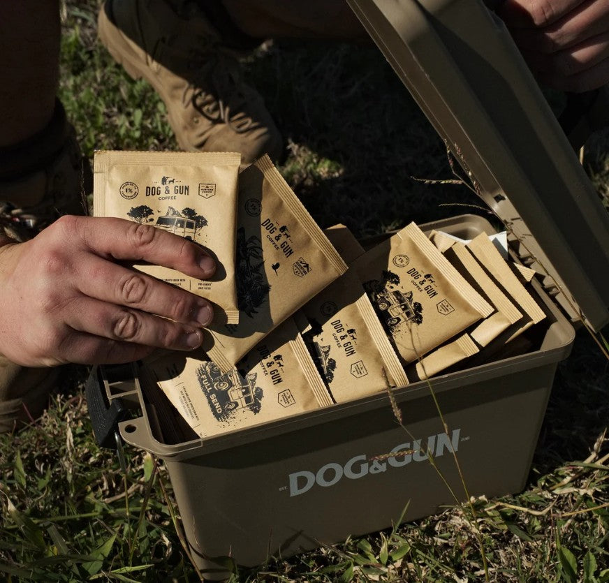 All drip filters are individually sealed and then jammed into a lockable ammo case with Dog & Gun custom branding. Hands down the most epic way that you can carry coffee (and/or contraband) while on the go.